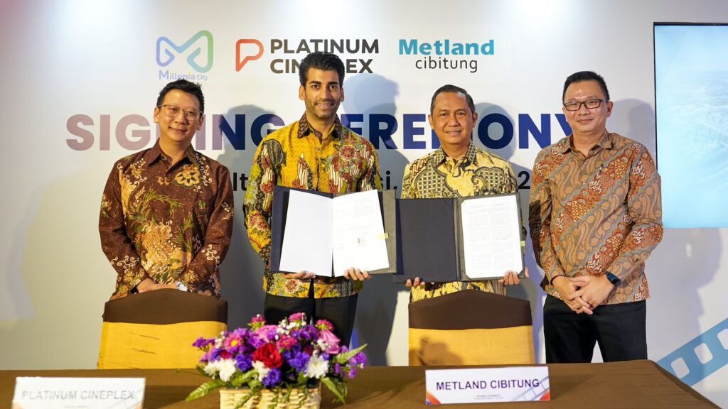 Penandatanganan MoU dilakukan oleh Presiden Direktur PT Metropolitan Land Tbk, Anhar Sudradjat dan Direktur PT Platinum Sinema – Member of MVP Group, Amit Ramesh Jethani (17/7). Bioskop Platinum Cineplex yang dilengkapi dengan 5 studio ini akan menjadi salah satu tenant entertainment utama seluas 1.300 meter persegi. “Hadirnya bioskop Platinum Cineplex diharapkan dapat menjadi varian tenant yang menambah daya tarik Milenia City sebagai pusat kegiatan dan hiburan bagi warga Metland Cibitung maupun masyarakat sekitar,” ucap Anhar Sudradjat pada saat penandatanganan MoU.